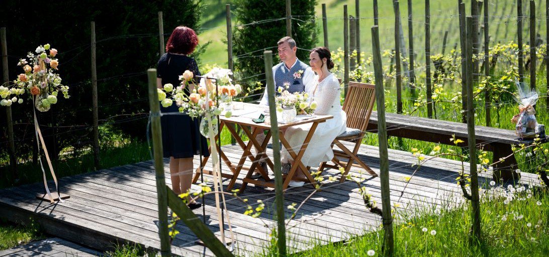 Jedes Detail wird mit viel Herz, Feingefühl und Erfahrung von uns organisiert. Die Brautleute müssen lediglich anreisen, sich wohlfühlen und den Tag genießen. Wer es besonders stimmungsvoll möchte, kann auf Wunsch zusätzliche Services wie einen Blumenstrauß, Schokoladenfondue oder prickelnden Uhudler Frizzante ergänzen.